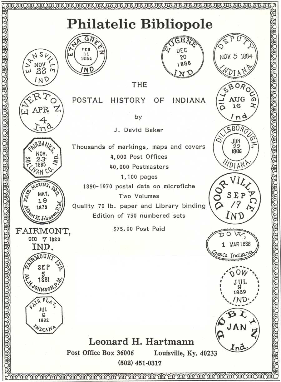 BOOKS on PHILATELYOur first book, Dave Baker's The Postal History of Indiana appeared in 1976 and our second in 1982. We are now on schedule and expect to publish a number of fine new books. We hope to issue one new book per year and promise that each will be a truly fine work.
